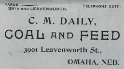 The 1900 Omaha city directory has an entry for Charles in the classified business directory. Under the heading “Feed, Hay and Grain. (Retail.),” the entry reads: “Dailey C. M. 3901 Leavenworth.”7 One of Charles’ business cards having this same address has survived and its image has been provided to me by one of Charles’ great grandsons.