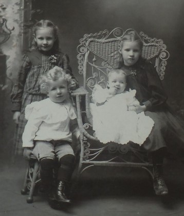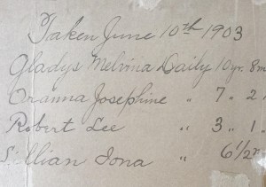 Robert truly did have a head full of curls. A portrait of Charles and Maggie’s children attests to this fact. On June 10, 1903, the Daily children posed for the portrait. This was about six months after Maggie had given birth to their third daughter, Iona, who was born on November 20, 1902. The ages of the children are written on the back of the portrait.