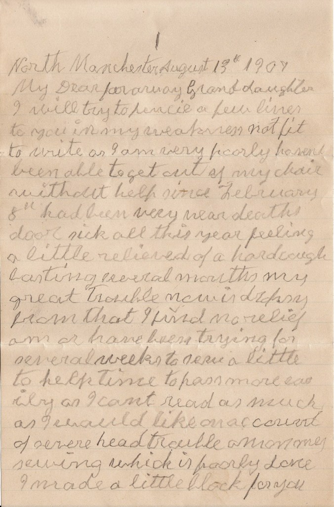 The letter that Maggie received was from her paternal grandfather’s second wife, Amelia Mary Bonewitz. Maggie’s paternal grandfather was John Adam Bonewitz. His first wife Mary Margaret Rider died in 1859, eight years before Maggie was born. A year later, John married a widow named Amelia Mary (nee Hower) Noftzger. At the time of writing the letter to Maggie, Amelia was about ninety years old and she was suffering from dropsy which refers to “swelling caused by fluid retention” (now called edema) and it usually occurs in the feet, ankles and legs.23 The text of Amelia’s letter follows: