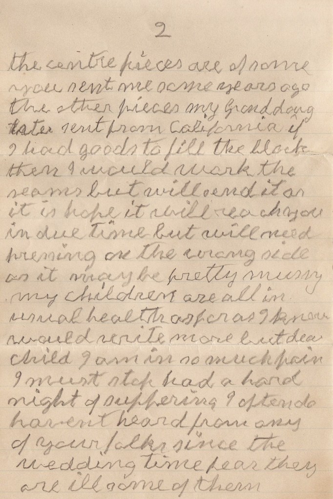 the centre pieces are of some you sent me some years ago the other pieces my Granddaughter sent from California if I had goods to fill the block then I would work the seams but will send it as it is hope it will reach you in due time but will need pressing on the wrong side as it may be pretty messy [?] my children are all in usual health as far as I know would write more but dea child I am in so much pain I must stop had a hard night of suffering I often do havent heard from any of your folks since the wedding time fear they are ill some of them