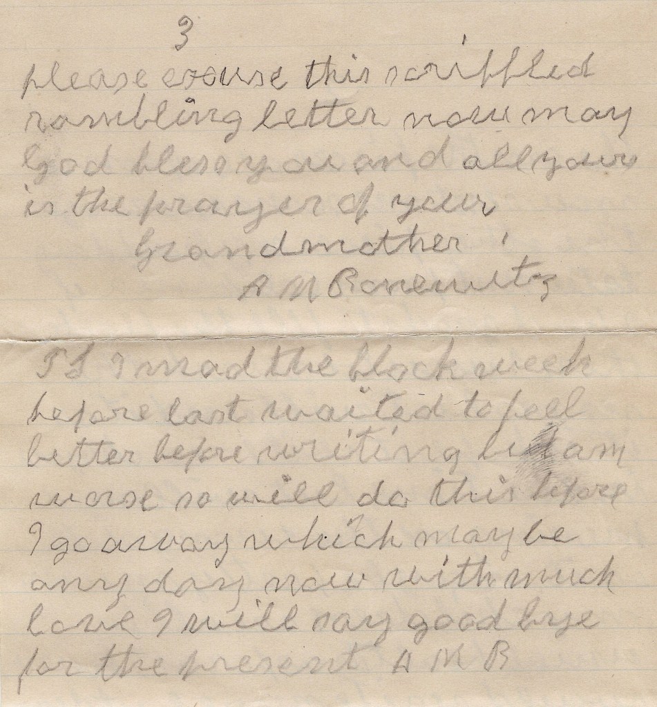 P S I mad the block week before last waited to feel better before writing but am worse so will do this before I go away which may be any day now with much love I will say good bye for the present A M B