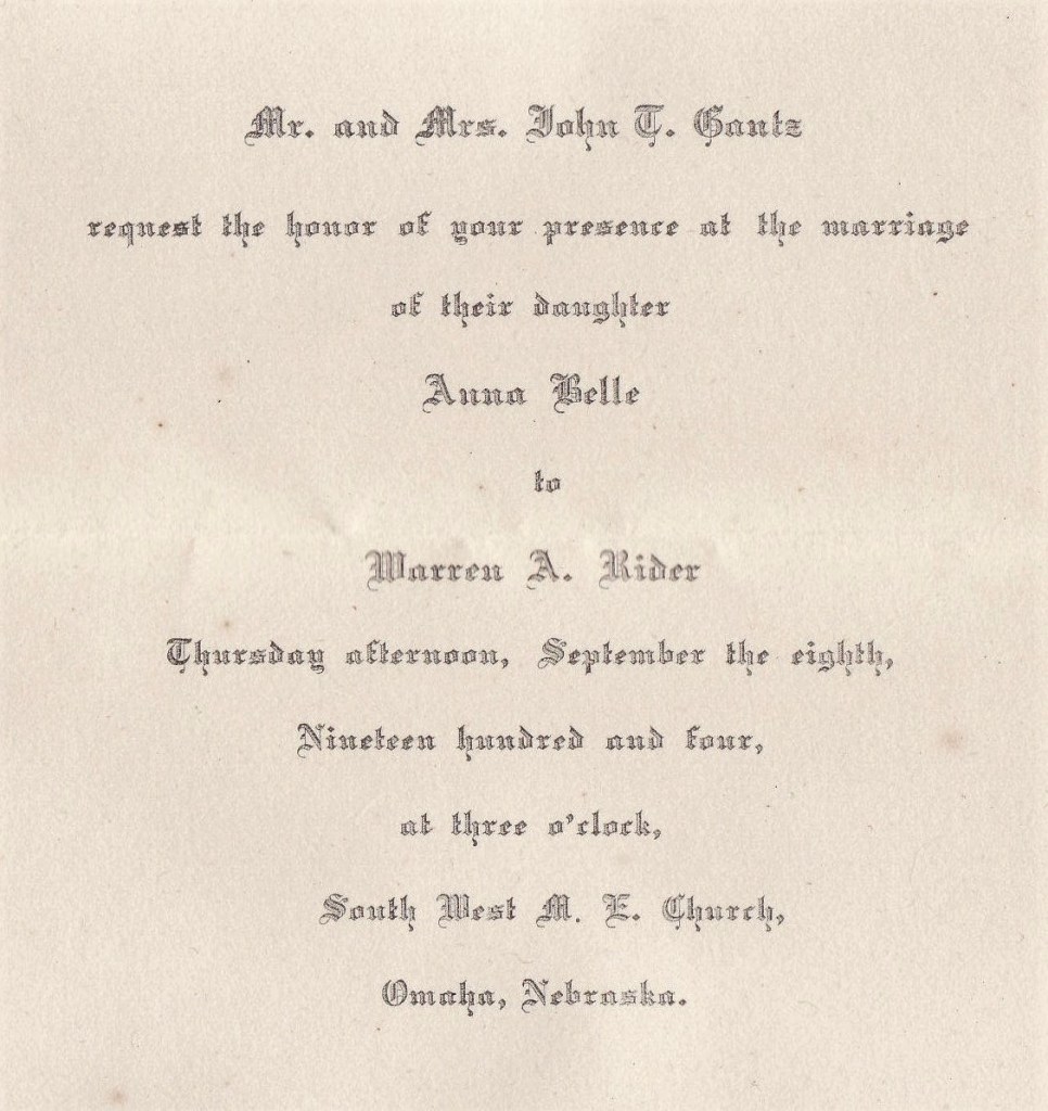 Another memento in the trunk is the wedding invitation of Maggie’s cousin Anna Belle Gantz (the daughter of Maggie’s aunt Joannah Gantz). Anna Belle married Warren A. Rider, whose family lived in Fairfield, Iowa when Maggie’s family and her aunt Joannah’s family lived there in 1880.18 The marriage ceremony was on Thursday, September 8, 1904 at South West Methodist Episcopal Church in Omaha. The church was only two blocks from the home of John and Joannah Gantz.