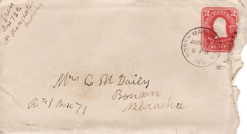 An additional item that is in the previously-mentioned trunk is a letter addressed to Mrs. C. M. Daily. The envelope was postmarked August 13, 1907 in North Manchester, Indiana. It cost two cents to mail and it was addressed to R #1 Box 71, Benson, Nebraska. The Benson Post Office was about four miles to the northwest of downtown Omaha20 and it was about nine miles from the location that Robert identified as the location of the farm where the Dailys lived.