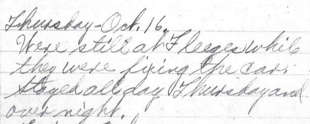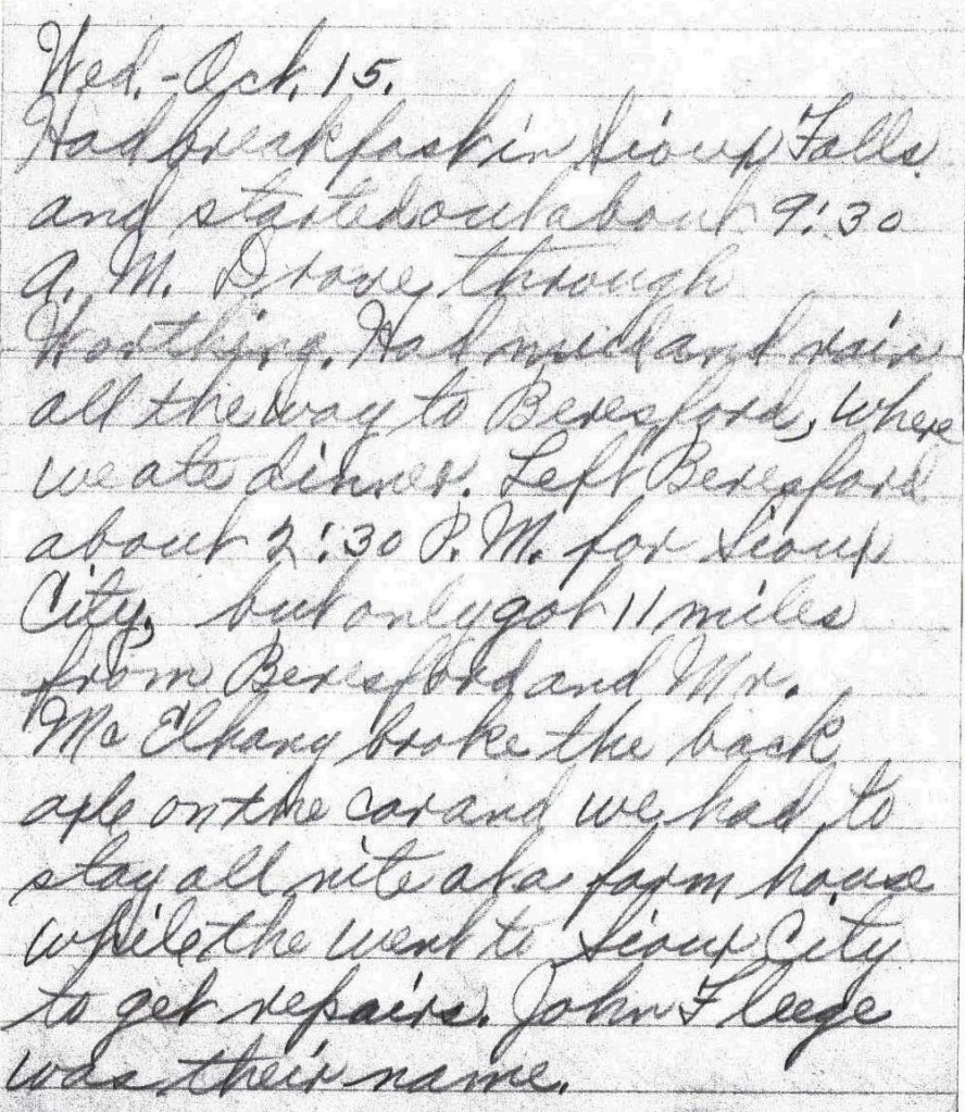 Left Council Bluffs about 8:00 A. M. Had fine roads. Ate dinner on the roadside. Got into Auburn, Nebr. about 5 P. M. and stayed all night. Had supper here. – Lena Bevers
