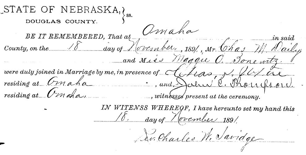 The 1900 Omaha city directory has an entry for Charles in the classified business directory. Under the heading “Feed, Hay and Grain. (Retail.),” the entry reads: “Dailey C. M. 3901 Leavenworth.”7 One of Charles’ business cards having this same address has survived and its image has been provided to me by one of Charles’ great grandsons.