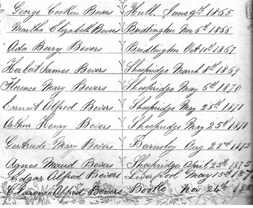On the northeast coast of England lies the town of Bridlington. Alfred C. Bevers and his wife Mary (nee Bridges) with their infant son George (see George C. Bevers, Bookkeeper) arrived in the town sometime between late 1865 and late 1866. Mary gave birth to a daughter in November 1866 but the newborn only lived 16 days. The following fall, on October 10, 1867, she gave birth to another daughter, which they named Ada Berry Bevers, according to the entry in Alfred and Mary Bevers’ Family Bible (see Alfred and Mary Bevers’ Family Bible). The name Berry was the maiden name of the second wife of Ada’s grandfather William Bevers. William had married Susanna Berry in the first quarter of 1865.1 Even though the Family Bible indicates that her name was Ada Berry Bevers, most of Ada’s genealogical records use a middle initial of “N” which stands for Naomi, her mother’s middle name.