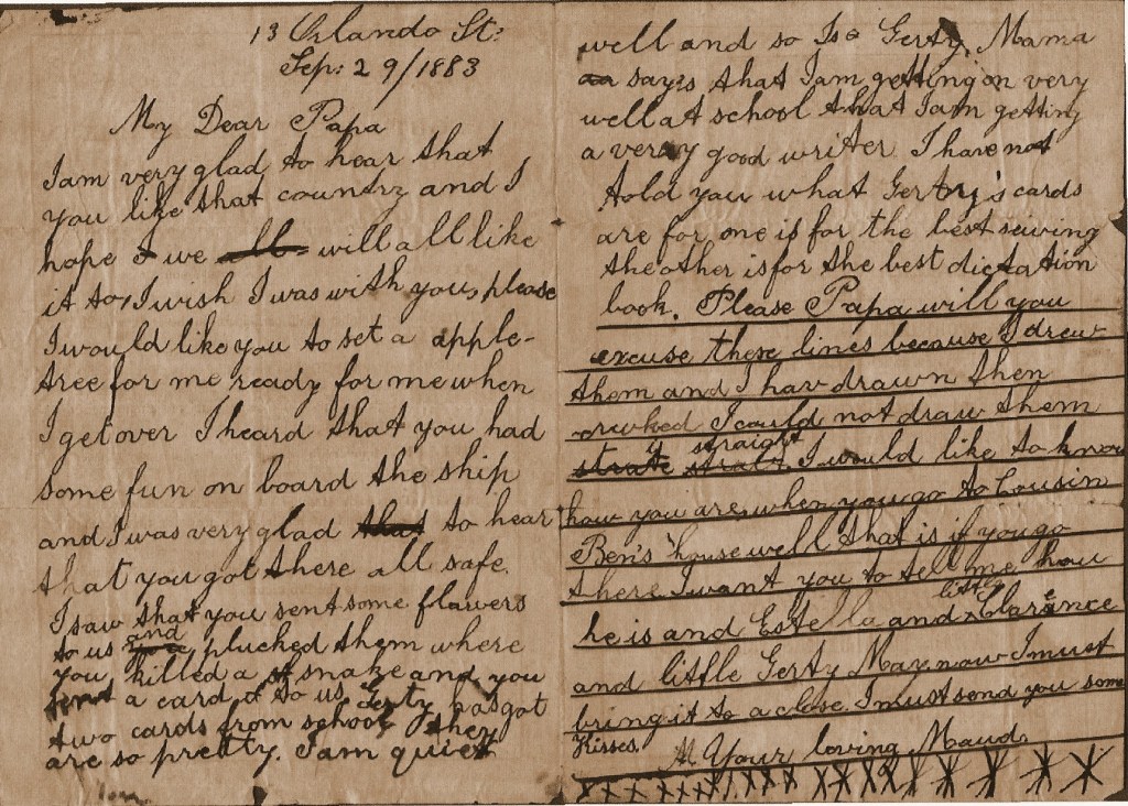 I am very glad to hear that you like that country and I hope we will all like it to, I wish I was with you, please I would like you to set a apple-tree for me ready for me when I get over I heard that you had some fun on board the ship and I was very glad to hear that you got there all safe. I saw that you sent some flowers to us and plucked them where you killed a snake and you sent a card to us. Gerty has got two cards from school they are so pretty. I am quiet well and so Is Gerty. Mama say’s that I am getting on very well at school that I am getting a very good writer I have not told you what Gerty’s cards are for one is for the best sewing the other is for the best dictation book. Please Papa will you excuse these lines because I drew them and I hav drawn them crooked I could not draw them straight. I would like to know how you are. when you go to Cousin Ben’s house well that is if you go there I want you to tell me how he is and Estella and little Clarence and little Gerty May. now I must bring it to a close. I must send you some Kisses.