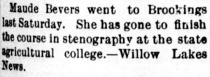 In May 1897 the local newspaper reported that Maude had gone to Brookings to finish a stenography course at the state agricultural college.30 That fall, Maude was elected Secretary of a class society at the college.31 Several months later, it was reported that Maude had left the college and accepted a position.32 Family historians of the Bevers family have stated that Maude began working as a secretary for Alfred N. Waters, a prominent businessman of De Smet in Kingsbury County.33 Possibly that is the position she took when she left the college. In 1898, Gertrude and Maude moved with their parents to De Smet. That year Gertrude turned 26 years-old and Maude turned 23. They would spend the rest of their lives, over half a century, in De Smet.