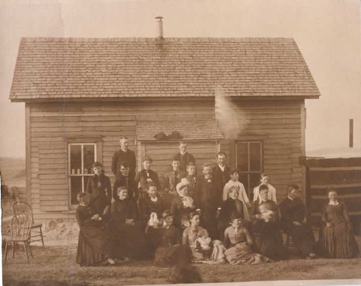 Late in the 1880s, the girls’ father filed a claim for a homestead a few miles northeast of Henry in Phipps Township, Codington County. In front of the small frontier house that was built on the homestead, family and friends gathered to celebrate the 25th wedding anniversary of their parents which occurred on September 19, 1889. A photograph was taken of the gathering. Maude (age 14) and Gertrude (age 17) can be seen standing in white dresses on the right of the group. Ada (age 21) is sitting on the ground on the left. Their parents are in the center, Mary wearing a white hat with Alfred standing to the right of her. Their brother Herbert is standing in the back row on the far left. It is believed that Lena Huppler, who would become Herbert’s wife, is standing on the far left in the row in front of Herbert. It is also believed that William Mankey, who would become Ada’s husband, is standing in the back row on the far right.
