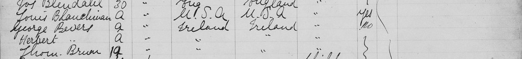 Both brothers would also emigrate to the United States, and it is possible that they made the trip together in the fall of 1885.  Some of the details of an entry in a passenger list of the steamship, Lord Clive, correspond with information about George and Herbert, but some does not correspond.  This passenger list includes the names George Bevers and Herbert Bevers.11  The spelling is the correct spelling, but Ireland is recorded as their place of birth.  The Lord Clive departed from Liverpool, which would very likely be the port where the brothers would have departed.  This steamship arrived at the port of Philadelphia on December 1, 1885.  This date corresponds with information in the 1900 U. S. census which states that George C. Bevers immigrated in 1885.12 But the 1900 U. S. census record for Herbert J. Bevers indicates that he didn’t immigrate until 1888.13  The passenger list of the Lord Clive provides additional information about the men: they were both laborers, they had never been to the United States and they were not tourists.  Something that is missing on the ship manifest is the age of George and Herbert Bevers.  If that information had been recorded, there would have been additional information to confirm whether the record is about our families’ ancestors.