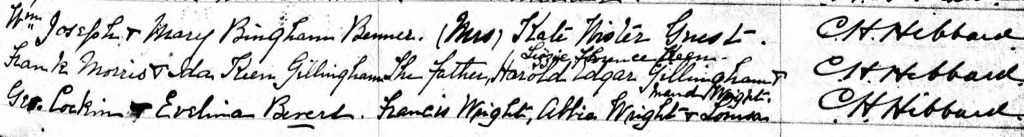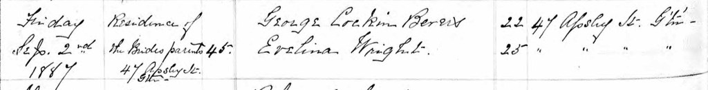 In 1887 and for a few years afterwards, the Philadelphia city directory would list George and Arthur at the same address: 47 Apsley in Germantown, which was a suburb northwest of Philadelphia.15  In that home on Friday September 2, 1887, George married Arthur’s daughter Evelina.16  The marriage record can be found in the marriage register of the Church of Saint John the Baptist, an Episcopal church.  One of the witnesses was Evelina’s brother Ernest Wright.  Two years later, the baptism register of this same church has a record of George and Evelina’s daughter Evelina.  The record documents her birth as September 8, 1889 and her baptism on Thursday, December 26, 1889.17  Two of the sponsors of the infant Evelina were her uncle Francis Wright and her aunt Louisa Wright, her mother’s brother and sister.  In July 1888, George had declared his intention to become a citizen of the United States.18