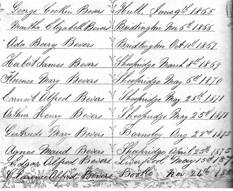 George Cockin Bevers was the first child born to Alfred Cockin Bevers and Mary Naomi Bridges.  They recorded his birth in their Family Bible as June 9, 1865 in Hull.  His birth is also recorded in the civil registration records of Hull, Yorkshire East Riding.1  The full name of this town is Kingston-Upon-Hull, the name it was given after King Edward I had purchased the town and gave it a royal charter.2  The name is a derivative of King’s Town upon Hull (referring to the river Hull.)3  A hundred years before George was born, Hull was the birthplace of William Wilberforce, the champion of the abolition of the slave trade and slavery in the British Empire.4