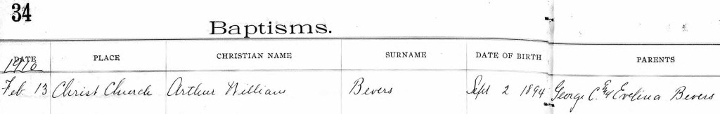 During George’s childhood Alfred and Mary Bevers moved their residence several times.  The locations are recorded in their Family Bible with every child’s birth, and sadly, with the deaths of some of George’s siblings.  By the time he was 17 years old, George had 10 siblings.  Six of his siblings died in their first year of life or shortly after.