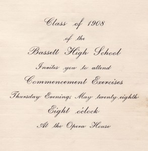 One of Charles and Maggie’s grandsons is the keeper of a trunk which holds many mementos of the Daily family. One item is an invitation to the Commencement Exercises of Bassett High School in Bassett, Nebraska. Maggie’s cousin’s (Viola J. Griffith) children were two of the nine graduates in the Class of 1908, graduating on May 28. For a period of time during Maggie’s childhood, Viola and her brother William and their mother Malissa Griffith (nee Smith) lived in Maggie’s home in Iowa.14 Five years after their mother died in 1880,15 Viola married John G. Van Winkle in Keya Paha County, Nebraska, with William standing as a witness of the marriage.16 Viola’s children who graduated from Bassett High School 23 years later were Josie and Orlando Van Winkle whose ages (based on their ages in the 1900 U. S. census) were 20 and 17, respectively.17 Josie may have been named after Maggie’s mother Josephine Smith and Orlando may have been named after Maggie’s uncle Orlando Smith. Bassett was about 230 miles from Omaha in north central Nebraska.