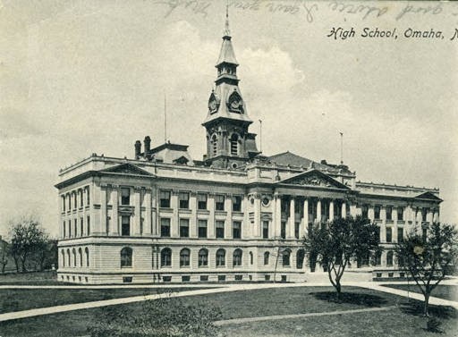 “Omaha High School was located at 20th and Dodge Streets. In the late 1890s, the original brick building was deemed unsafe and unhealthy. Construction began on the replacement building in 1900. The east section was completed and in use by 1902. The south section was completed in 1905, and the west section was completed in 1910. The last section was completed in 1912. Parts of the original building were used until 1910. The old building was then removed, leaving an open courtyard at the center of the new building.”12