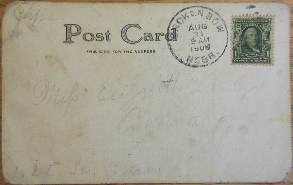 On one of Charles’ trips, he mailed a postcard from Broken Bow, Nebraska, to his three-and-a-half year-old daughter Elizabeth. The upper left corner notes his name as “Papa” and the cost of the postage stamp was one cent. Although the penciled address is extremely faded, the postcard was addressed to their home in Omaha.
