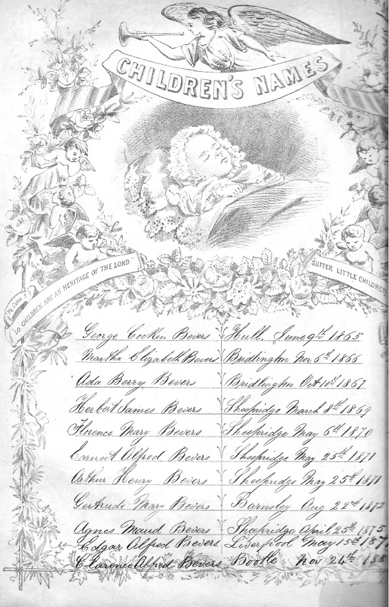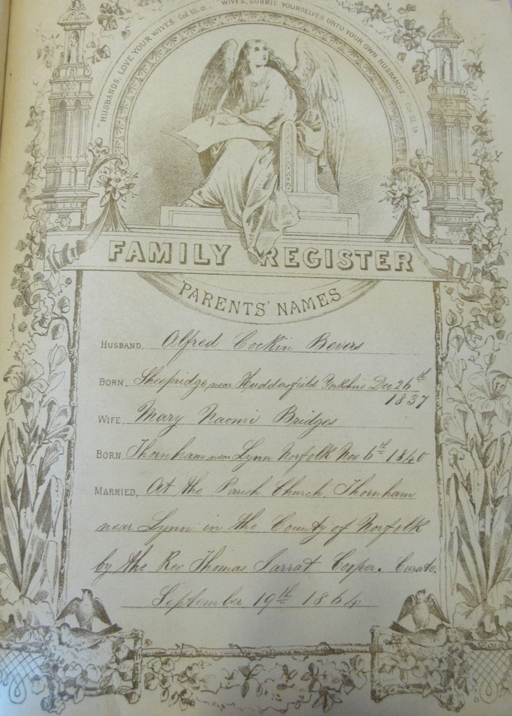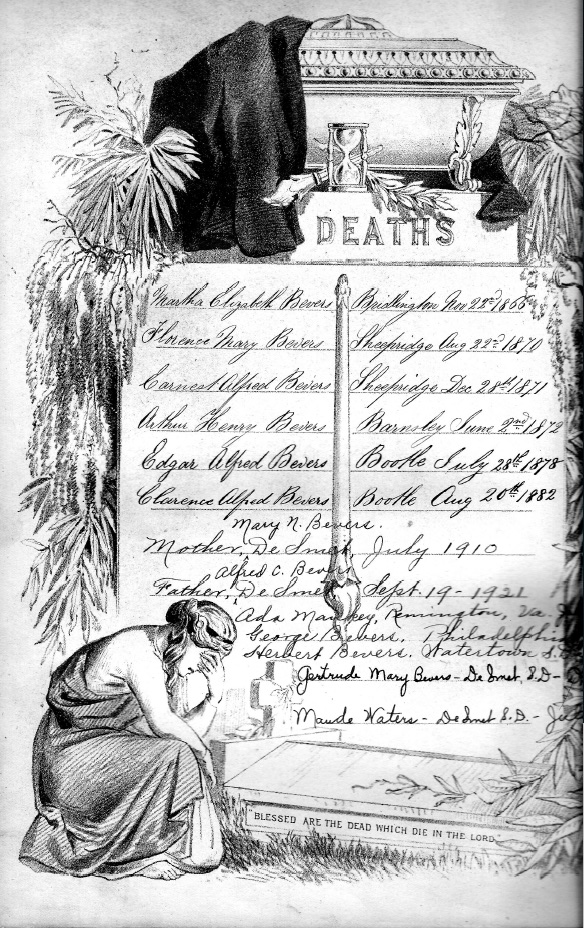 In their Bible, there are pages for recording family information. It is assumed that most of the handwriting on these pages is either Alfred or Mary’s handwriting. Note the handwriting on the page that records the details of their marriage and the pages listing their children’s births and deaths. The page of the children’s marriages appears to be written in different handwriting and it is not known whose handwriting it is. The entries for the deaths of Mary and Alfred begin with “Mother” and “Father” so they may have been written by one of their children. Also on the page of the deaths, a third person made the final notes, which were entered in Vera Bevers’ handwriting.3