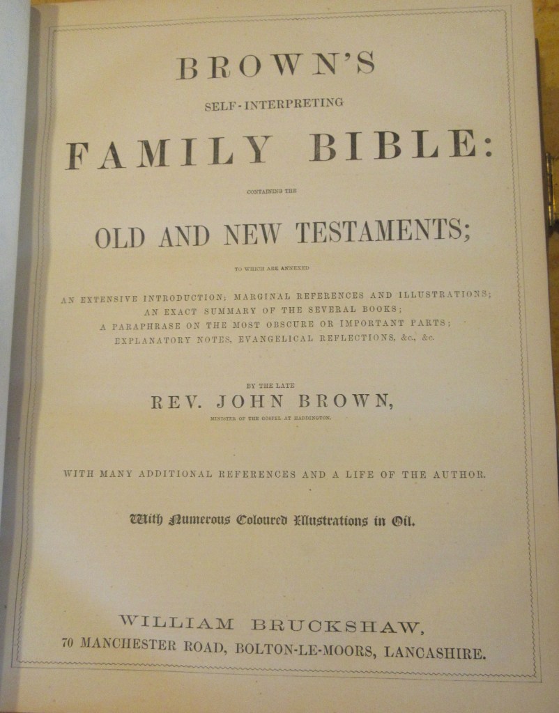 One of the items Alfred and Mary brought with them was a Bible, which was entitled Brown’s Self-Interpreting Family Bible. The original edition of The Self-Interpreting Bible was published in 1778 by Rev. John Brown of Haddington, Scotland.1 During a period of about 140 years, Brown’s Bible would be reprinted many times in Scotland and America.2 Although there is no publication date printed in Alfred and Mary’s Bible, it was probably printed after 1859. (For more information about their Bible, see the blogpost, Alfred and Mary Bevers’ Family Bible.)
