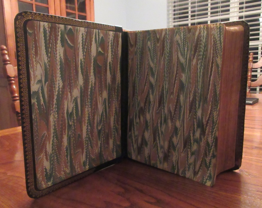 At some point, repairs were made to the “The Breitenstein Bible.”  It appears that the front and back covers have been externally re-hinged, meaning that on the outside new leather was applied at the hinge in order to attach the covers to the spine.  On the inside of the front and back covers, the original endpapers have been replaced with endpapers with a striking design.