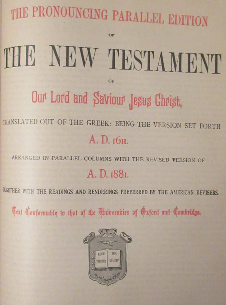 • The New Testament in parallel columns, containing the Authorized and Revised Versions