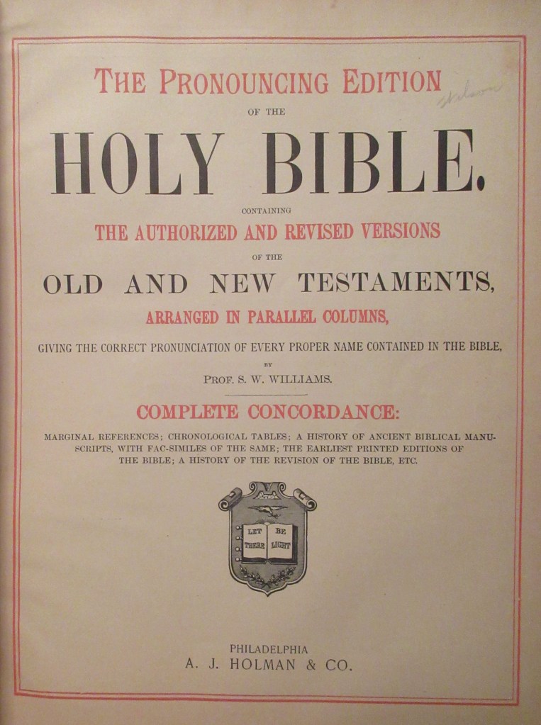 The title of this publication is THE PRONOUNCING EDITION OF THE HOLY BIBLE. Printed in Philadelphia, Pennsylvania, the editor was Professor S. W. Williams and it was published by A. J. Holman and Company. Its most distinctive characteristic is that it contains a translation of the scriptures into English, dated 1611 and “commonly known by the name of the Authorised Version,”1 which is printed alongside a Revised Version of the scriptures dated 1881. The title page explains the contents as follows: