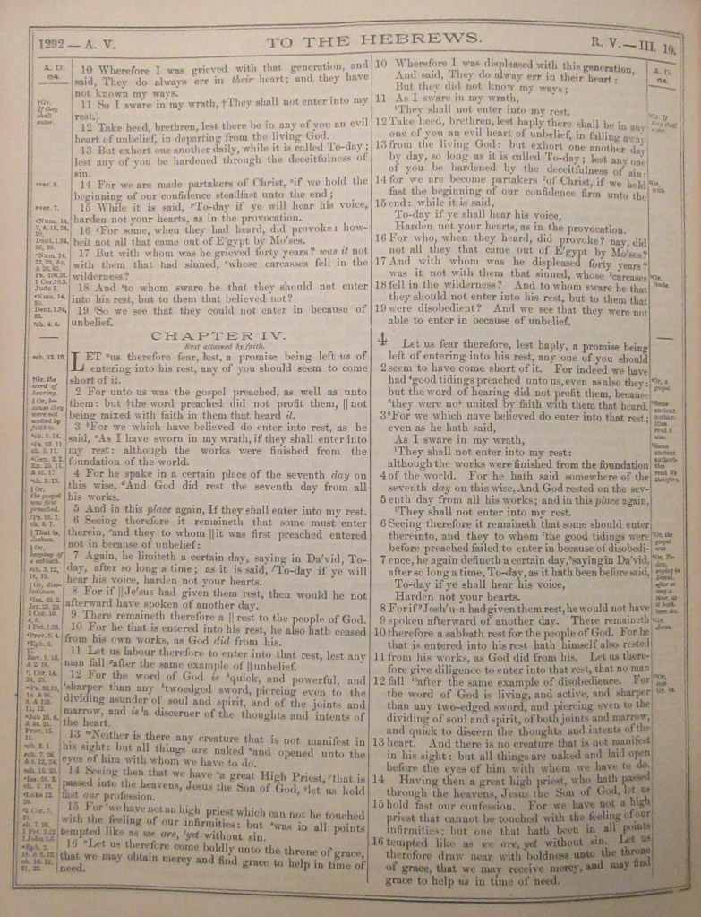 A page of the book of Hebrews with the 1611 Authorised Version on the left, printed beside the 1881 Revised Version on the right
