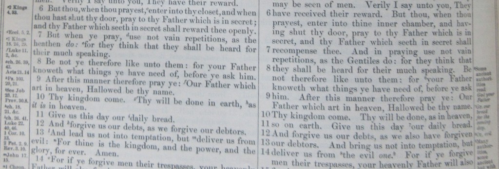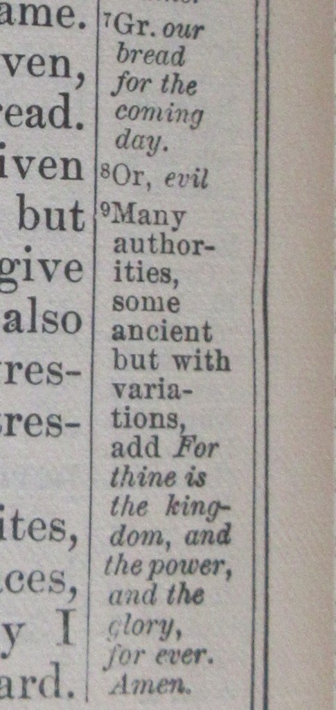 • For verse 11, the American Committee preferred a different translation of the Greek for the phrase “our daily bread.”  The Committee made their preference known by requesting that a note be included in the margin stating that there was an alternate reading of the original Greek.  The alternate reading being “our bread for the coming day.”24