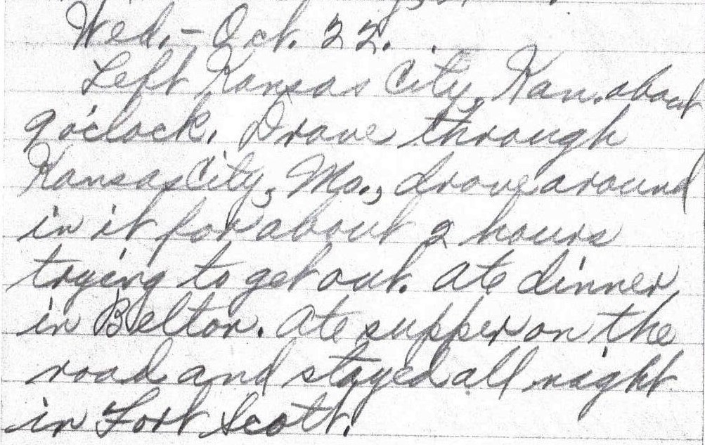 Left Kansas City, Kan. about 9 o’clock.  Drove through Kansas City, Mo., drove around in it for about 2 hours trying to get out.  Ate dinner in Belton.  Ate supper on the road and stayed all night in Fort Scott. – Lena Bevers