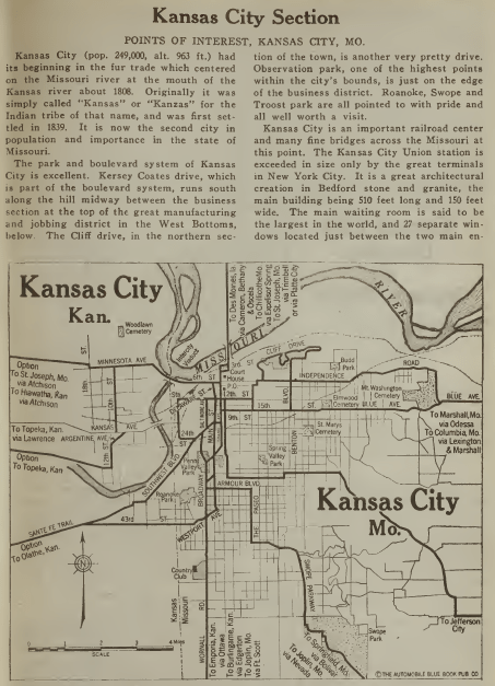 On October 22, 1919 the Bevers family started their day by going across the Kansas river from Kansas City, Kansas to Kansas City, Missouri.  The running directions of Route 1042 of The Official Automobile Blue Book 1917 state that there was a 15-cent toll for crossing the Intercity Viaduct one-way and 25-cent toll for round-trip.2  (This is the bridge that crossed the Kansas River at Minnesota Avenue.)  But in the 1920 edition of the Blue Book, there is no toll.3  In 1917 Kansas City, Kansas and Kansas City, Missouri bought the bridge and in 1918 the two cities opened the bridge as a free bridge.4  So when Herbert and Mr. McElhany drove over the viaduct they didn’t have to pay a toll.  A sister bridge was built in 1962.  The two bridges are now called the Lewis and Clark Viaduct.  Presently, the eastbound lanes of Interstate Highway 70 travel over the original inter-city viaduct built in 1907.5  When my mother and I crossed the Kansas River today, we were driving on the same bridge that Herbert and Lena drove on.