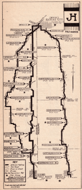 Upon entering Missouri, the speed law was: “‘Careful and prudent manner’; not exceeding 25 miles per hour.”7  After crossing the bridge, the two-car caravan somehow lost their way in Kansas City, Missouri.  They “drove around in it for about 2 hours trying to get out.”8  Possibly they were trying to exit the city on the King of Trails Highway.  Lena only mentions traveling through one town between Kansas City and their final destination, Fort Scott, which doesn’t provide enough information to determine on which side of the Kansas-Missouri border they traveled on.  Florence’s travel log gives additional information: “Drove thru Stillwell, Louisburg, La Cygne, Trading Post, Pleasanton, Linton, Prescott, Fulton, and stayed all night in Ft. Scott.”9  According to a 1924 Rand McNally map of Nebraska and Kansas, the King of Trails Highway does not travel through any of those towns.10  Apparently, the highway they got on was the Jefferson Highway, another north-south transcontinental route.
