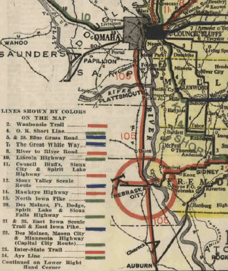 - Rand McNally and Company, Commercial Atlas of America, “Auto Trails Map, District No. 12, Southern Nebraska, Eastern Colorado, Kansas, Northeastern New Mexico, Northern Oklahoma” (Chicago: Rand McNally & Company, 1924): 372-373, https://www.davidrumsey.com/luna/servlet/detail/RUMSEY~8~1~201708~3000668:AutoTrails-Map,-Southern-Nebraska.