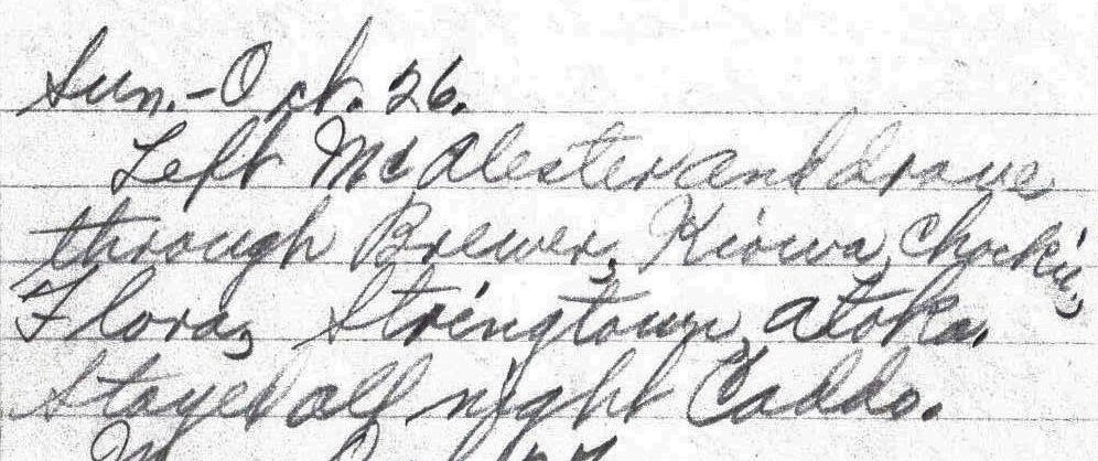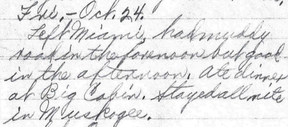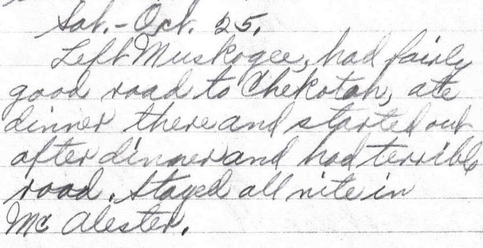 Left Caddo and had fine roads all the way. Ate dinner in Denison while Mr. McElhany got his car fixed. It would not run good. Left there and drove to Van Alstyne where we stayed all nite. – Lena Bevers