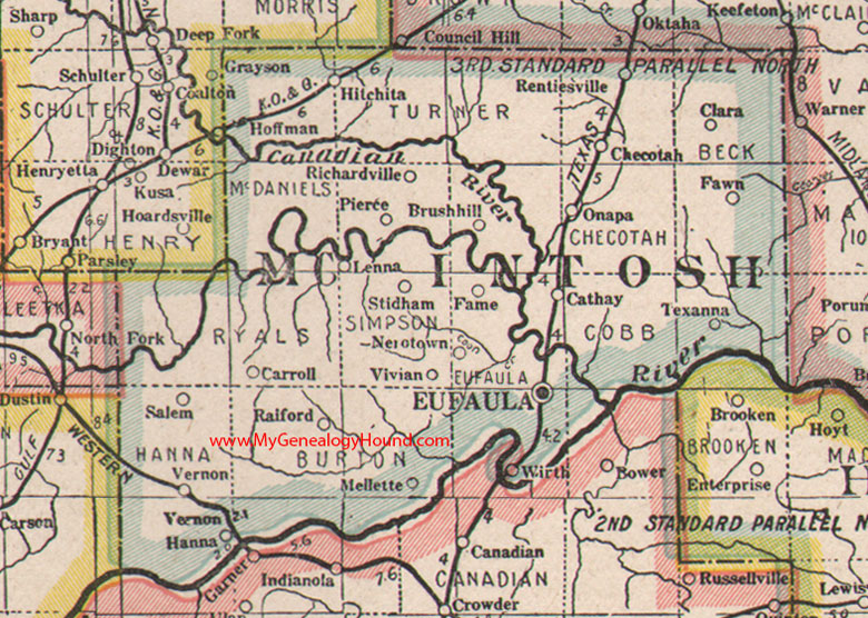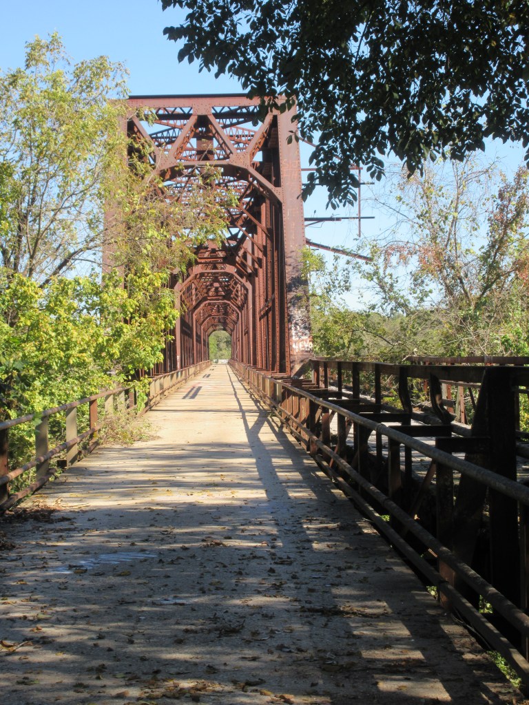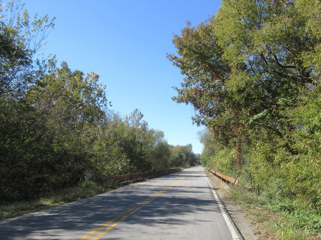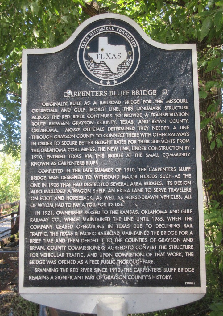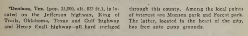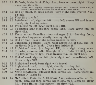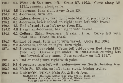 Below are the running directions of Route 721 in The Official Automobile Blue Book 1920, explaining the route to take from Durant, Oklahoma to Denison, Texas. A few miles after Colbert, the automobiles had to cross the Red River on a toll bridge.6 This was probably the third toll bridge that the Bevers family crossed. The toll for this bridge was 25 cents per car. The other bridges were at Omaha and La Platte, Nebraska. Today, we drove to a bridge that may be the one that the Bevers crossed. It is called the Carpenters Bluff Bridge. It is no longer in use, so we crossed the Red River on a modern bridge to the north of Carpenters Bluff Bridge. Lena mentioned in her travel log that Mr. McElhany got his car fixed in Denison, Florence explained that the engine was not running right. At the bottom of the running directions there are two garages noted.